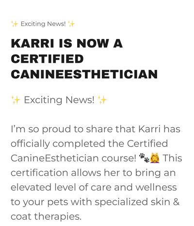 - Karri is a Certified Master Groomer and Certified Canine Esthetician with extensive training in breed‑specific cuts, skin and coat health, and gentle handling techniques. Her expertise ensures each pet receives tailored grooming that enhances comfort, appearance, and overall well‑being.